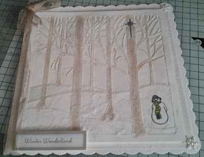 Using Clarity card, a post it circle mask and some torn paper masks I brayered the landscape using first a blue and then a very light touch of black dye based ink. The snow effect in the sky is the result of a light spray of water. I stamped 2 of the hares from the woodland stamp set and the wood using the small 3 trees stamp several times. I also used this stamp sideways to make the tufts of grass. I added a few extra tufts with a black pen. For the background I stamped the mistletoe sprig over the card in versamark and embossed with snowflake tinsel embossing powder. Finally I lightly sponged this with first the same blue and black inks I had used for the main picture.